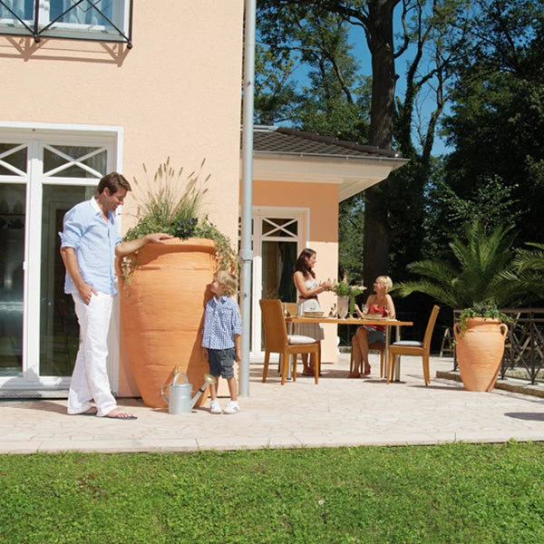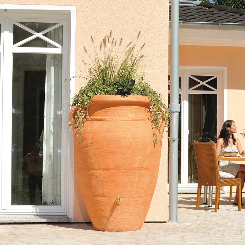 Manufactured from plastic – which has been finished to give a realistic look of a ceramic vase. UV stabilised and weather resistant to last throughout the seasons it will not chip, crack or fade. Please note – if temperatures fall below freezing you should drain the water butt.