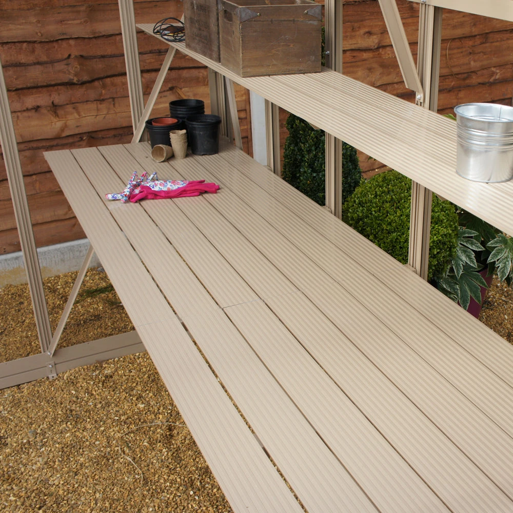 Diamond Shelving – made from extruded aluminium you will receive sufficient to fit down one side of the greenhouse. It will come with the same finish as the greenhouse. It is two slats wide, 7″ / 19cm wide, 8″ / 22cm from the glass.Â