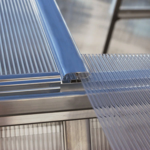 Twin Wall Polycarbonate Glazing – 4mm thick panels are used to glaze both the sides and roof of these greenhouses. It has a light transmission of 82% – so it diffuses strong sunlight, helping to protect plants from scorching on hot, sunny days. Twin wall polycarbonate also has excellent insulation properties, helping to keep warm in the winter and cool in the summer. Being 100% UV protected this glazing will not discolour, fracture or shatter, providing many years of use.